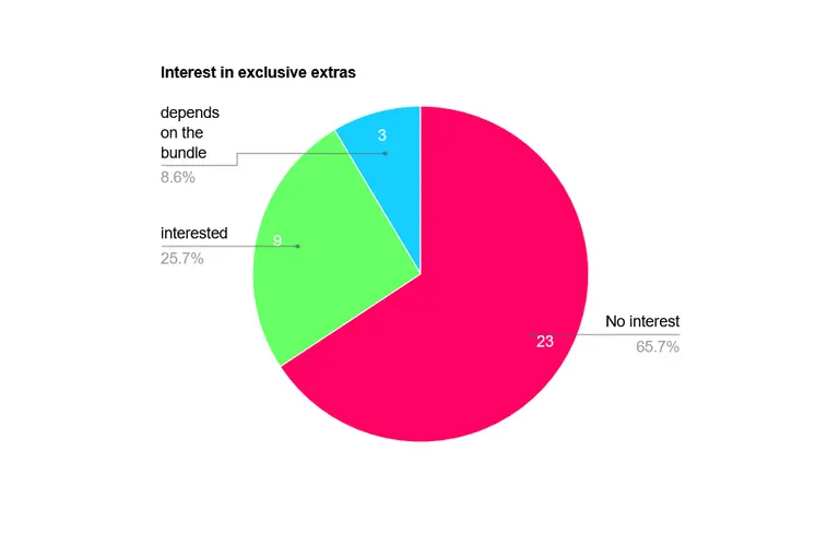 The mixed result indicates it might not be worth the extra effort and hassle that creating printables or exclusive artwork would bring for now. However, if itch.io continues to grow into a bigger platform, with larger audiences buying bundles, catering to the 25% of respondents who WOULD buy a bundle because of exclusive extras could well become viable in the future.