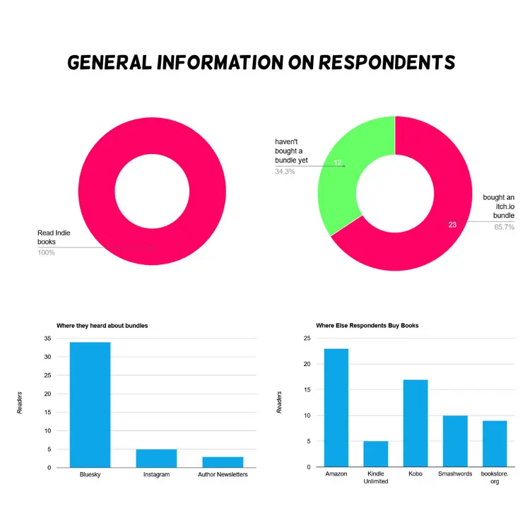 The questionnaire had 35 anonymous responses. All respondents say they read indie books, and two thirds (23 people) had bought an itch bundle before.
